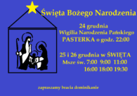 Zapraszamy do wspólnego świętowania uroczystości Narodzenia Pańskiego 24 grudnia Wigilia – Pasterska o godz. 22:00 25 grudnia – uroczystość Narodzenia Pańskiego 26 grudnia – święto św. Szczepana Msze św. o godz. 7:00, 9:00, 11:00, 16:00, 18:00, 19:30.